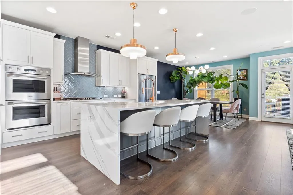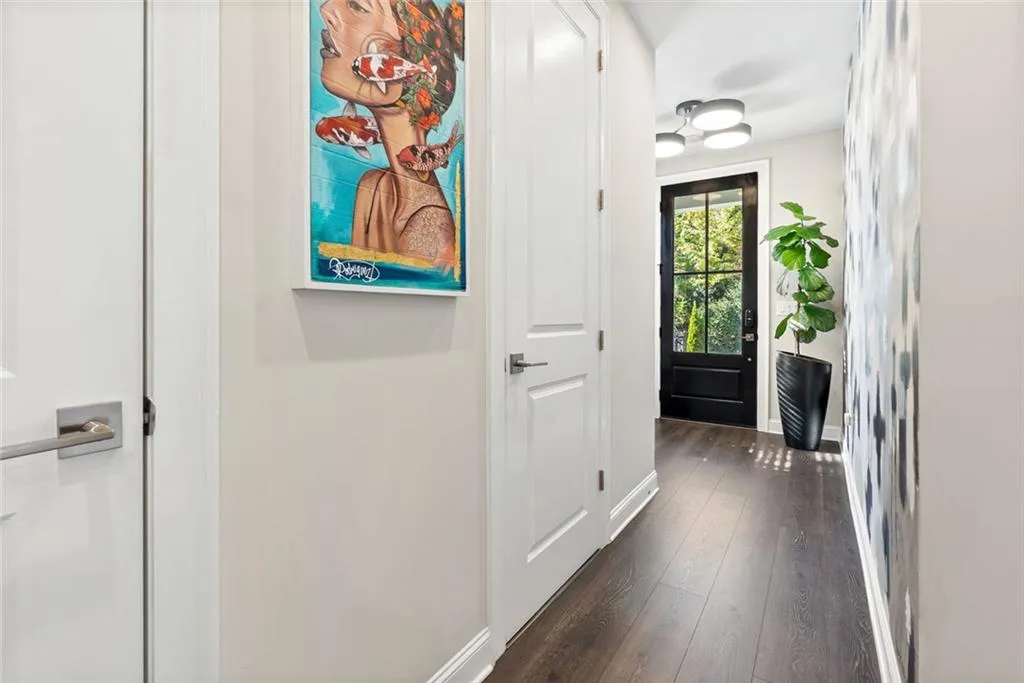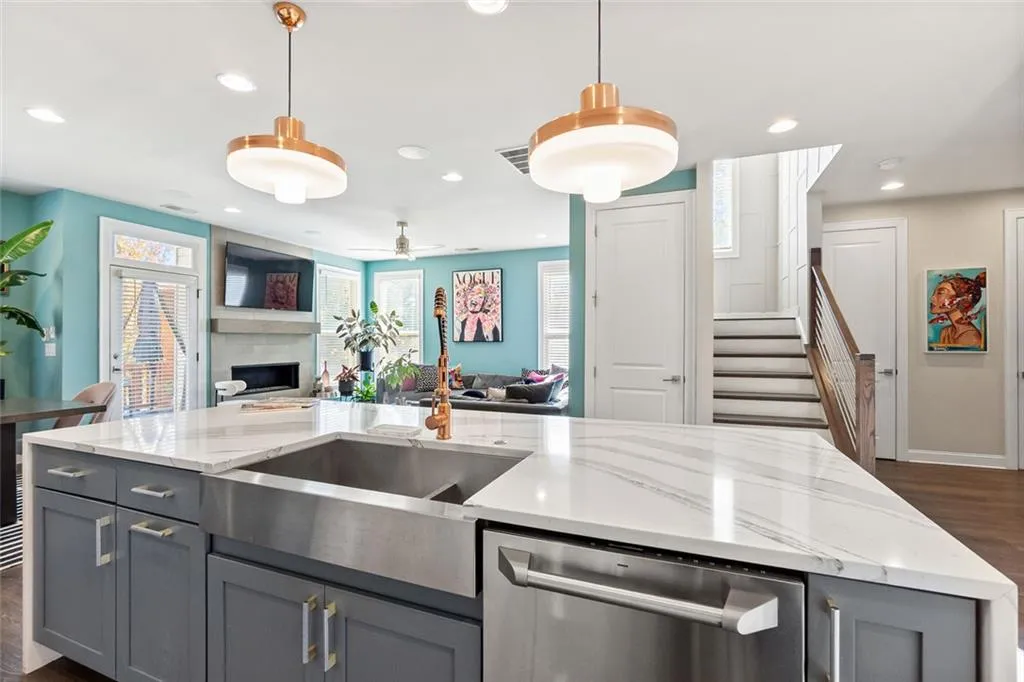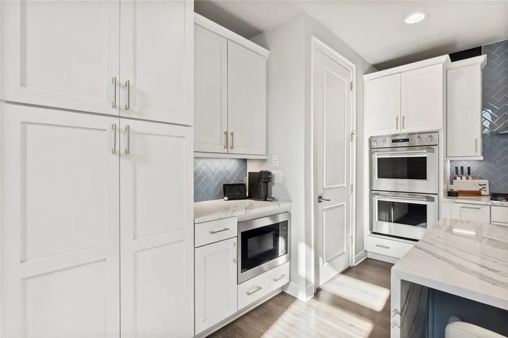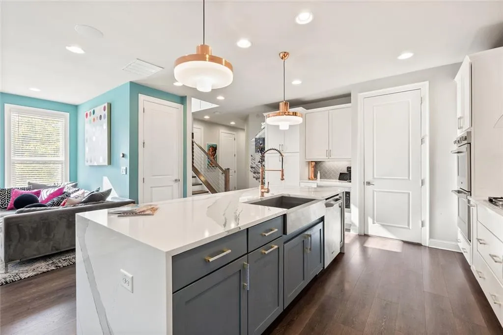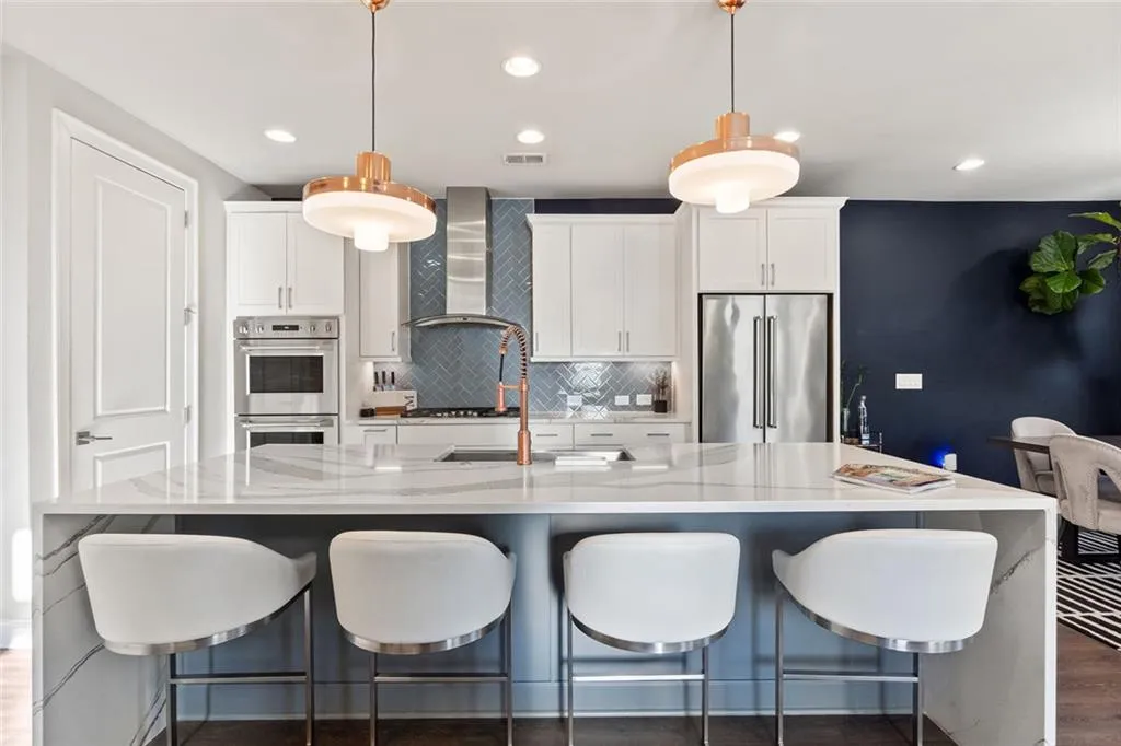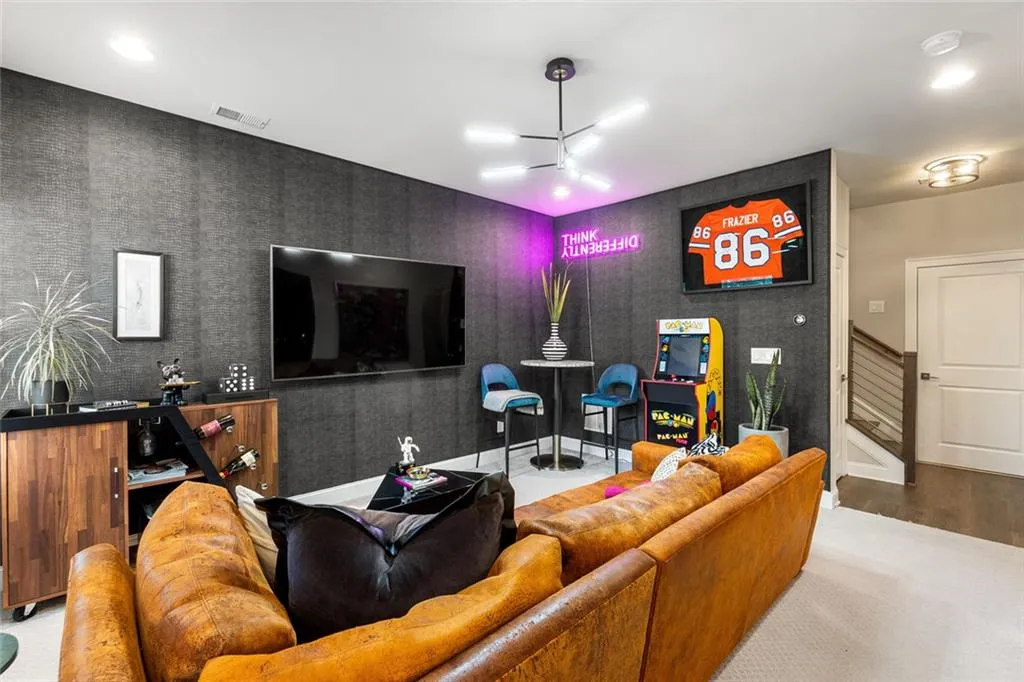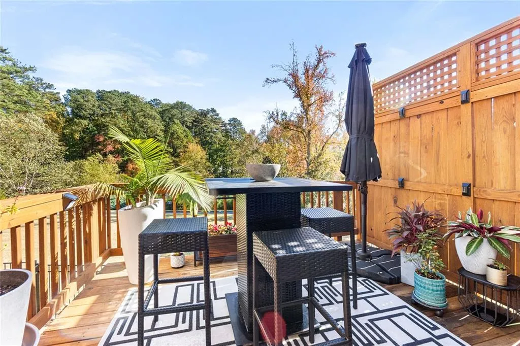Gorgeous & unique Townhome with FINISHED Basement and PRIVATE FENCED BACKYARD overlooking green space & lake w/fountain. The main floor includes KITCHEN LEVEL GARAGE, a luxurious OPEN PLAN with white kitchen cabinets housing upgraded appliances including DOUBLE OVENS, Cambria Quartz tops & WATERFALL ISLAND, a dining area & spacious family room with LINEAR REMOTE CONTROLLED FIREPLACE. Custom MODERN RAILINGS line the staircase up to the lake facing PRIMARY SUITE which features CUSTOM CLOSET SYSTEM & spa bath with VAULTED CEILING, FREESTANDING TUB & separate shower. Two more spacious bedrooms, shared bath w/DOUBLE SINKS and laundry with folding counter & storage cabinetry finish out the 2nd floor. The basement features a bedroom/office w/WIC currently used as recording studio, a full bath, MEDIA ROOM & tons of storage. OUTDOOR LIVING space includes open upper deck & lower SCREENED PORCH with electrical and TV mount already setup for you. Custom upgrades totaling over $200k were chosen by PROFESSIONAL INTERIOR DESIGNER so this is not the typical builder basic home! GATED neighborhood features HOA maintained yards (front AND back) and provides easy access to GA 400 with the convenience of being mere minutes from Canton Street restaurants and shopping!