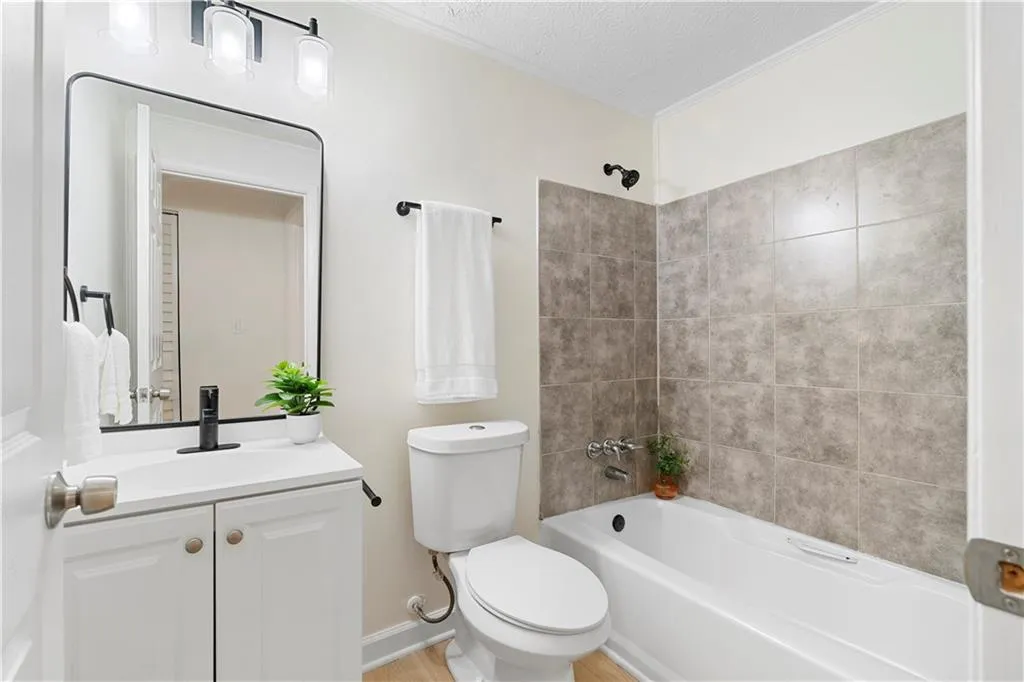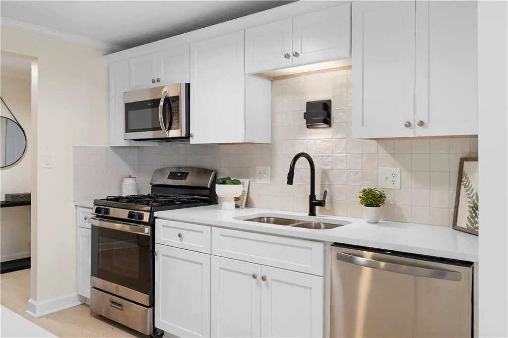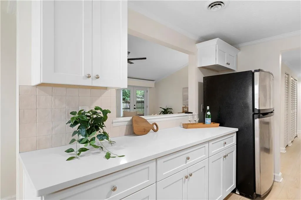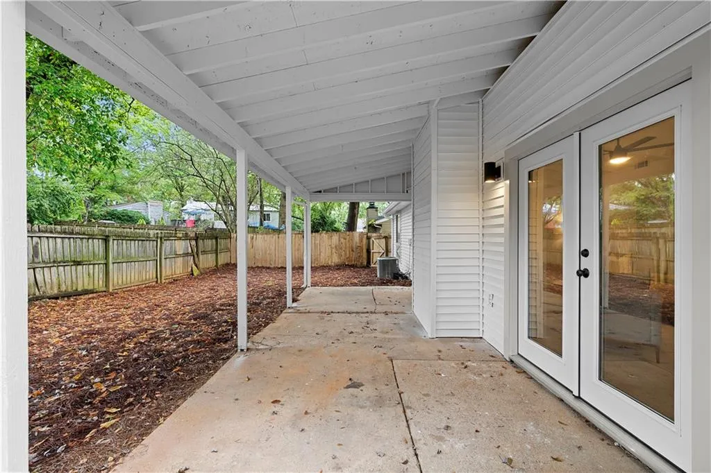 Charming, updated ranch in Roswell, GA with brand new roof. Step into the living room with a vaulted ceiling and cozy fireplace - perfect for relaxing. The kitchen features crisp white cabinetry, stainless steel appliances, stone countertops, and a tiled backsplash. The primary suite offers a private retreat with a fully renovated en-suite bathroom, luxurious shower, updated vanity, and trendy black hardware. The second bathroom has been similarly updated. The fenced backyard includes a covered patio, ideal for pets, relaxing, or entertaining. Additional features include a side patio and a two-car garage